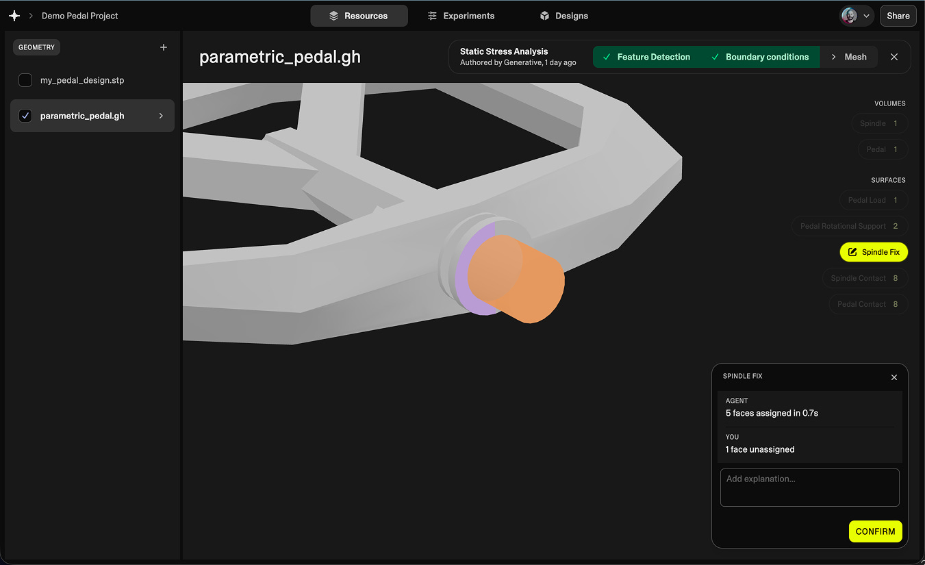 To reduce the setup time for automation (in order to enable the data-driven decisions that engineering teams need to move faster), we focus on all the steps around generation and simulation. We’ve developed AI agents to write the automation logic itself for parametrising geometry, feature-detection, geometry-preparation, meshing, configuring simulation, and post-processing. This removes the need for an agent to reason about each design at runtime, keeping all automation logic deterministic and traceable.